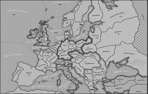 Figure 1. The Board of Diplomacy showing the 7 playable nations: Austria-Hungary, Britain, France, Germany, Italy, Russia, and Turkey.